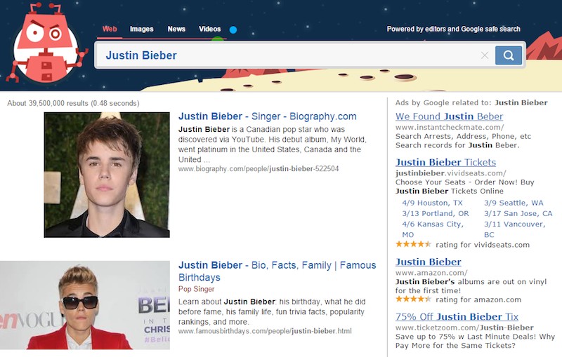 Recimo da vaše dijete želi saznati više o Justin Bieberu, ali biste radije da preskoči fotografije novijeg datuma – Kiddle će prikazivati samo odabrane, filtrirane sadržaje koji se tiču ovog izvođača.