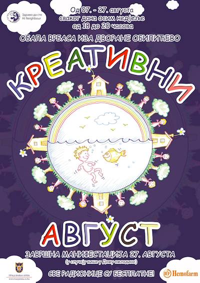 Udruženje građana “Zdravo da ste” organizuje manifestaciju “Kreativni avgust” koja će trajati od 7. do 27. 08. na obali Vrbasa iza Sportske dvorane “Obilićevo”.