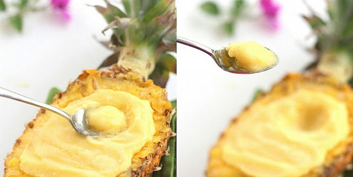 Presjecite ananas napola i izdubite mu sredinu, oštrom kašikom ili nožem. Izdubljeni dio, odnosno koru, nemojte da bacate – trebaće vam za deokoraciju.