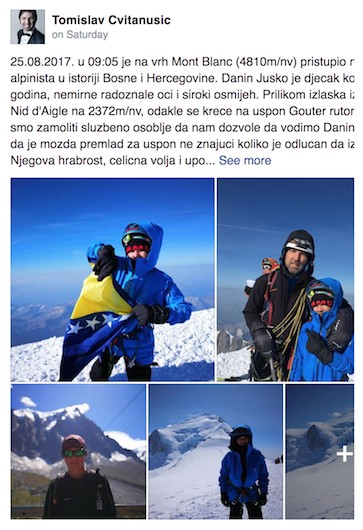 “U 9.05 je na vrh Mont Blanc (4810m/nv) pristupio najmlađi alpinista u istoriji Bosne i Hercegovine. Danin Jusko je dječak koji ima 12 godina, nemirne radoznale oči i široki osmijeh. Prilikom izlaska iz voza na Nid d’Aigle na 2372m/nv, odakle se kreće na uspon Gouter rutom, morali smo zamoliti službeno osoblje da nam dozvole da vodimo Danina, rekli su da je možda premlad za uspon ne znajući koliko je odlučan da izađe na vrh”, napisao je na svom Facebook profilu Tomislav Cvitanušić, član delegacije koja se popela jutros na Mont Blanc, a čiji status prenosimo u cijelosti.