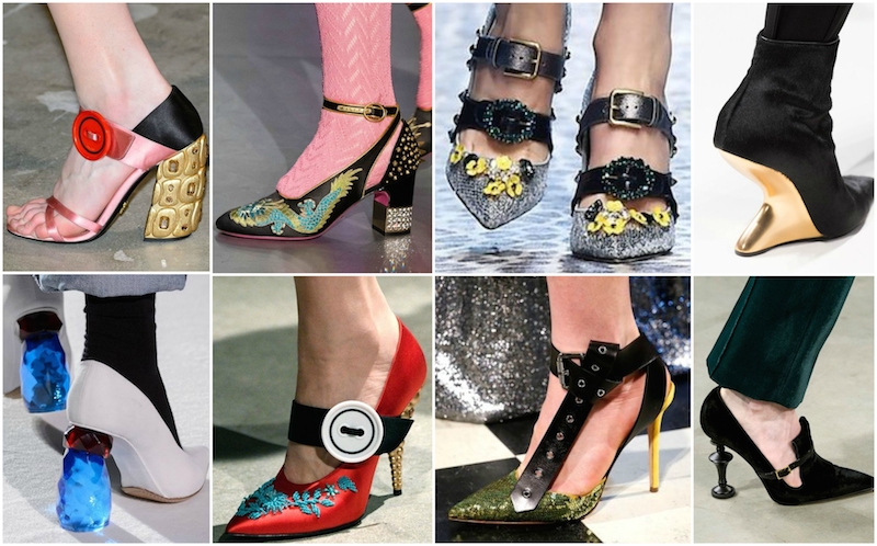 Pradine sa velikim dugmetom, D&G ikebana ukrašena žutim cvjetićima i kaišićima, Guccijeve zmajolike, i drugi modeli tzv. arhitektonskih cipela sa neobičnim potpeticama, više izgledaju kao umjetnički predmeti nego kao svakodnevno nosivi komadi. Ipak, zeleno-žute Monse salonke sa dugačkim kaišem ubrzavaju srčani ritam! 😀