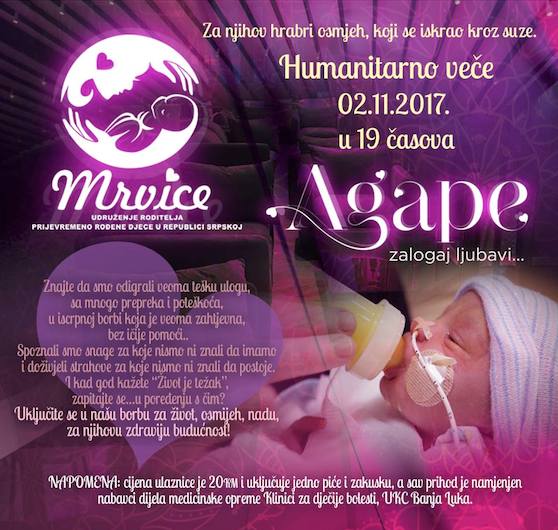 Humanitarno veče u Banjaluci održaće se u četvrtak 2. novembra u restoranu Agape, sa početkom u 19:00 časova. Ulaznice po cijeni od 20 KM uključuju jedno piće i zakusku, a mogu se kupiti putem facebook stranice ovog udruženja. Humanitarno veče u Kozarskoj Dubici, održaće se nekoliko dana ranije, u nedjelju 29. oktobra, u kafeu Beer Codex od 20:00, gdje će biti postavljena kutija za donacije.