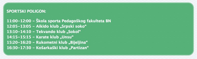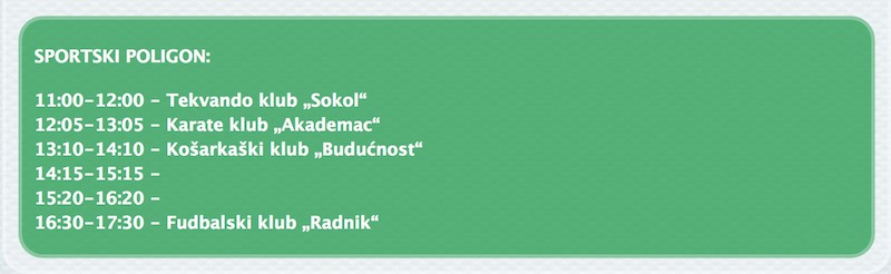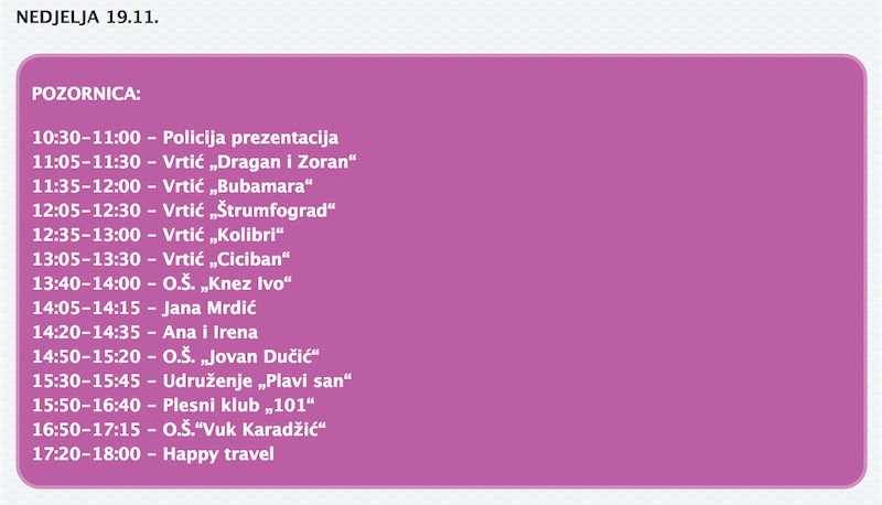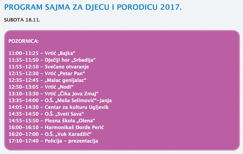 U nastavku možete da pogledate satnicu festivalskog i sportskog programa Sajma za djecu i porodicu 2017: