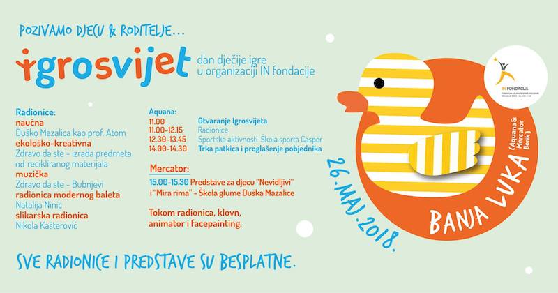 “Na samom kraju događaja planiramo i aktivnosti koja će imati za cilj da promovišu filantropiju i veću uključenost firmi i pojedinaca u brigu o djeci i to kroz trku gumenih dječjih patkica. Kako bi na poseban i kreativan način prikupljali sredstva za razvoj programskih aktivnosti IN fondacije pozivamo Vas da date svoje učešće u ovoj aktivnosti kupovinom minimalno jedne gumene patkice. Pojedinačna cijena patkice za pojedince iznosi 10 KM, a za firme 50 KM. Patkice će biti numerisane. Takmičenje će se organizovati u dvije kategorije; prva utrka patkica za pojedince i druga, za patkice koje su kupile firme. Sva prikupljena sredstva će biti usmjerena za naše projektne aktivnosti, a za prva tri pobjednika u obje trke osigurali smo nagrade zahvaljujući našim sponzorima”, navodi se u saopštenju organizatora.