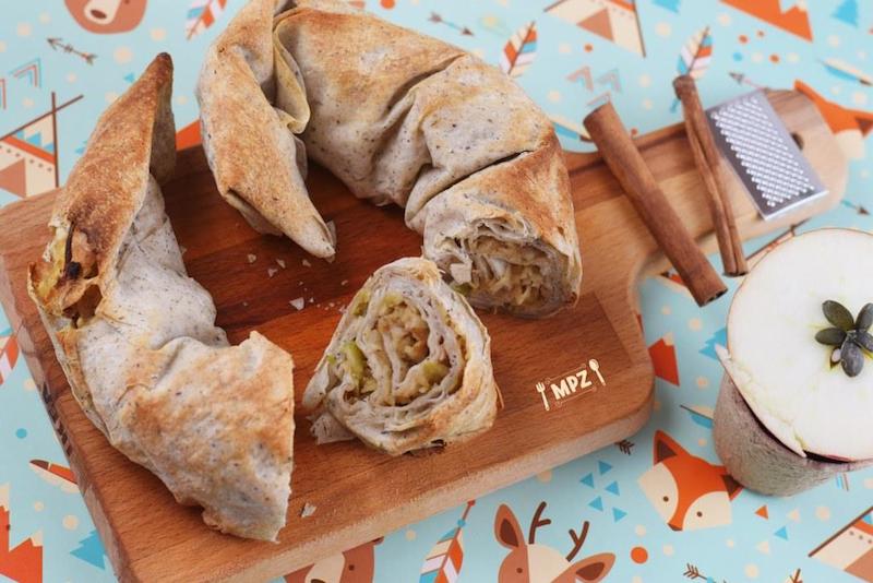 - Uzmite jednu koru, premažite sa malo ulja i vode, stavite drugu koru preko, ponovite isti postupak, dodajte treću i stavite 3 kašike nadjeva preko.