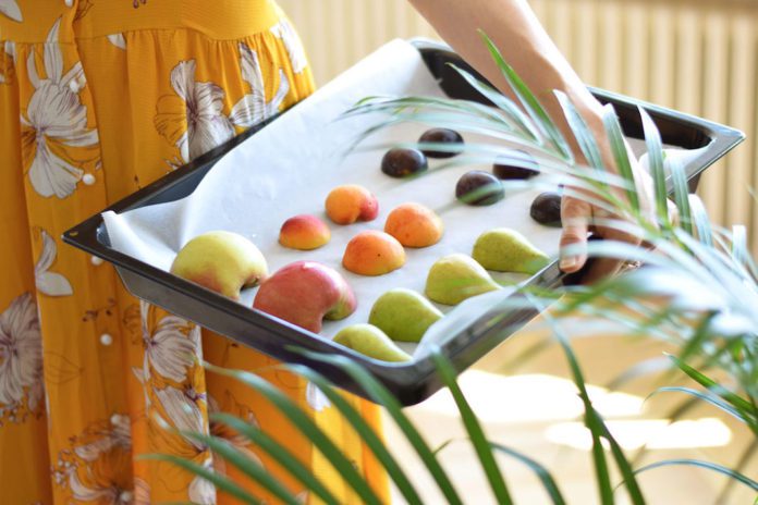 Tanko isijecite jabuke i kruške na kolutiće i stavite u rernu na pek papir na 50ak stepeni Celzijusa ili manje. Ostavite da se voće osuši od toplog vazduha. Čuvajte čips u zatvorenoj tegli do sljedeće užine (ako išta preostane).