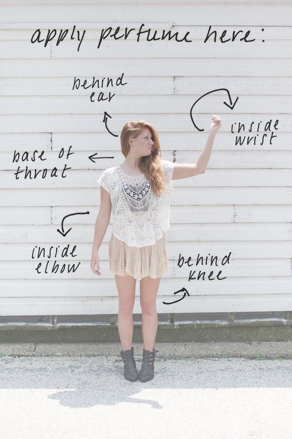 Ne špricajte parfem na sve strane. U početku ćete mirisati kao parfimerija, a onda će miris ispariti. Umjesto toga, aplicirajte ga na svoje pulsne tačke: iza ušiju, na dnu grla, na unutrašnju stranu zglobova, laktova i iza koljena.