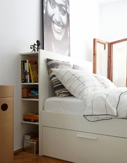 Umjesto da gurate krevet tik uza zid, najprije dodajte male police. Vodite računa o tome da budu plitke, kako vam stvari ne bi skliznule u unutrašnjost, jer sa tim nećete ništa postići.
