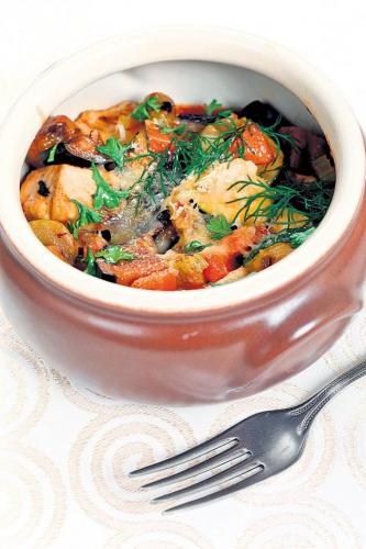 Izrežite krompir na krugove debljine jedan centimetar, mrkvu nešto tanje, a šampinjonima samo odvojte kapicu i peteljku. Luk isjeckajte na krupnije krugove, sve začinite, pa stavite u tepsiju i dodajte pola čaše tople vode. Pecite u zagrijanoj rerni na 200 stepeni oko pola sata, dok se povrće ne ispeče i ispari sva tečnost.