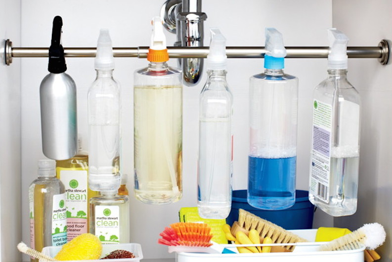 11. Postavite zateznu šipku ispod sudopera i nakačite na njih sredstva za čišćenje, i izbjeći ćete izvrtanje ambalaže i vječiti nered u skrivenom dijelu kuhinje.